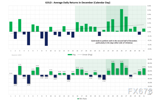 季节性因素也仍具支撑作用:数据显示,在圣诞节前后的交易日中,黄金通常呈现明确的上涨倾向,且概率相对较高。这意味着,在年底获利了结盘涌现之前,金价仍有可能进一步上行。