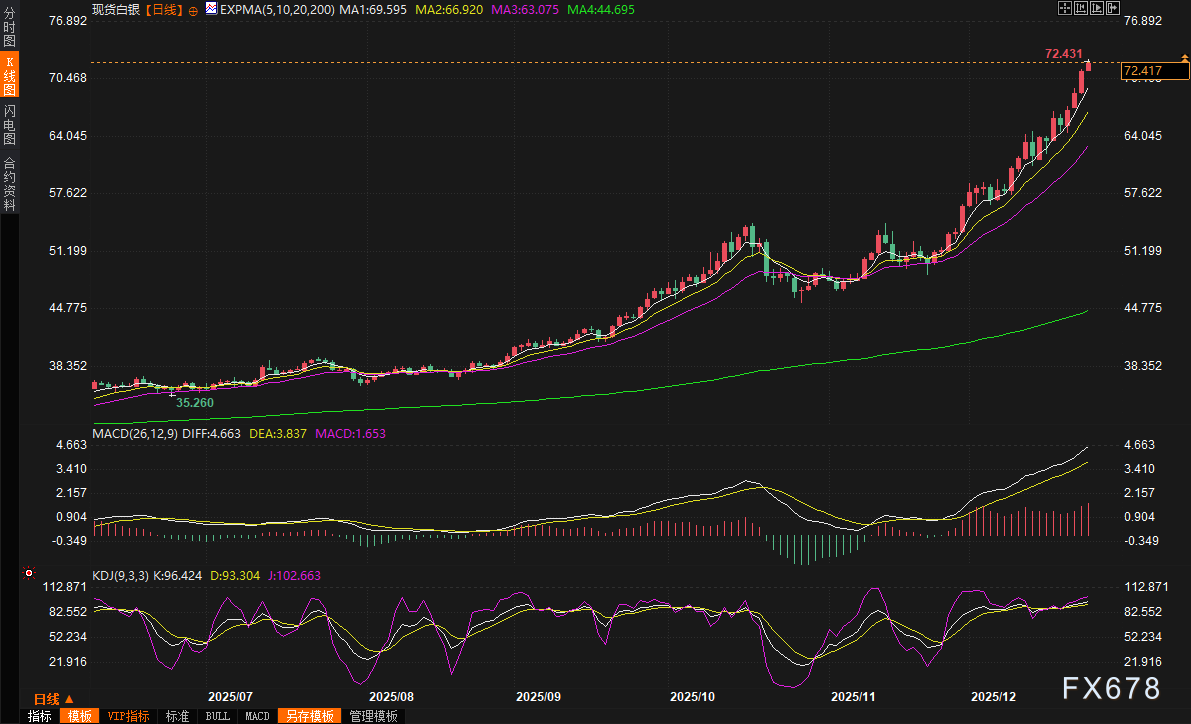 与此同时,白银的表现更为强劲,现货白银在周三亚洲时段一度上涨约1.2%,达到每盎司72.33美元左右,同样创下新高。本月白银涨幅逾28%,年内累计上涨约150%,远超黄金的年度表现。
