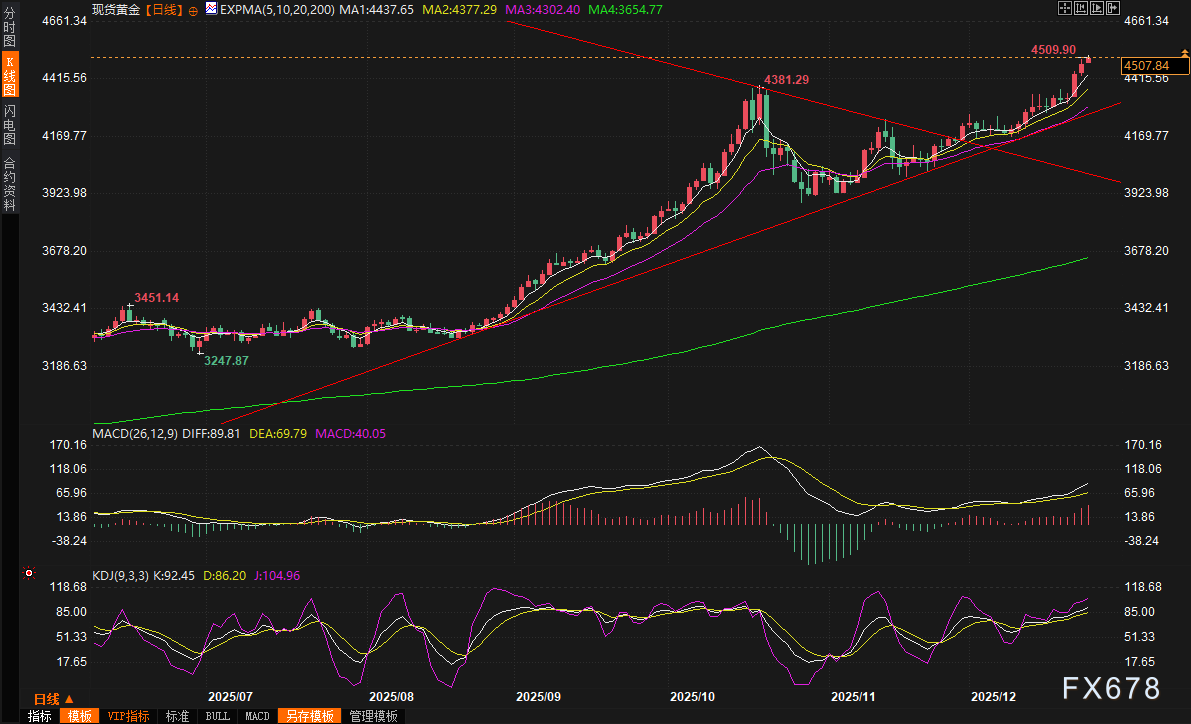 与白银同步,黄金价格也在周二展现出强劲的上涨动能,现货黄金上涨0.9%,逼近4500美元关口,并刷新历史高点,收报4484.5美元/盎司。周三亚洲早盘,黄金继续保持涨势,截至08:00,一度触及4509.90美元/盎司的纪录新高。今年以来,黄金价格已累计飙升约72%,这得益于多重利好因素的叠加,包括地缘政治紧张局势的升级、美国联储的降息路径、央行强劲的买盘以及投资需求的爆发。这些因素共同营造了一个有利于黄金避险属性的环境,让其成为投资者眼中的“安全港湾”。在全球经济不确定性加剧的背景下,黄金的这一轮上涨不仅反映了市场的恐慌情绪,还体现了投资者对通胀和货币政策调整的预期。