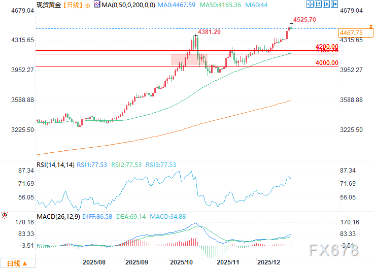 周三(12月24日)美盘时段,现货黄金在盘中触及4526.15美元的历史新高后,自高位小幅回落。当前价格走势或形成看跌的收盘反转顶部形态,但考虑到圣诞节假期临近市场即将休市,此次回落更像是投资者获利了结与平仓操作,而非趋势的实质性转变。今日可能出现“创高收低”的走势,但需下一个交易日进一步确认,才能判定趋势真正反转。