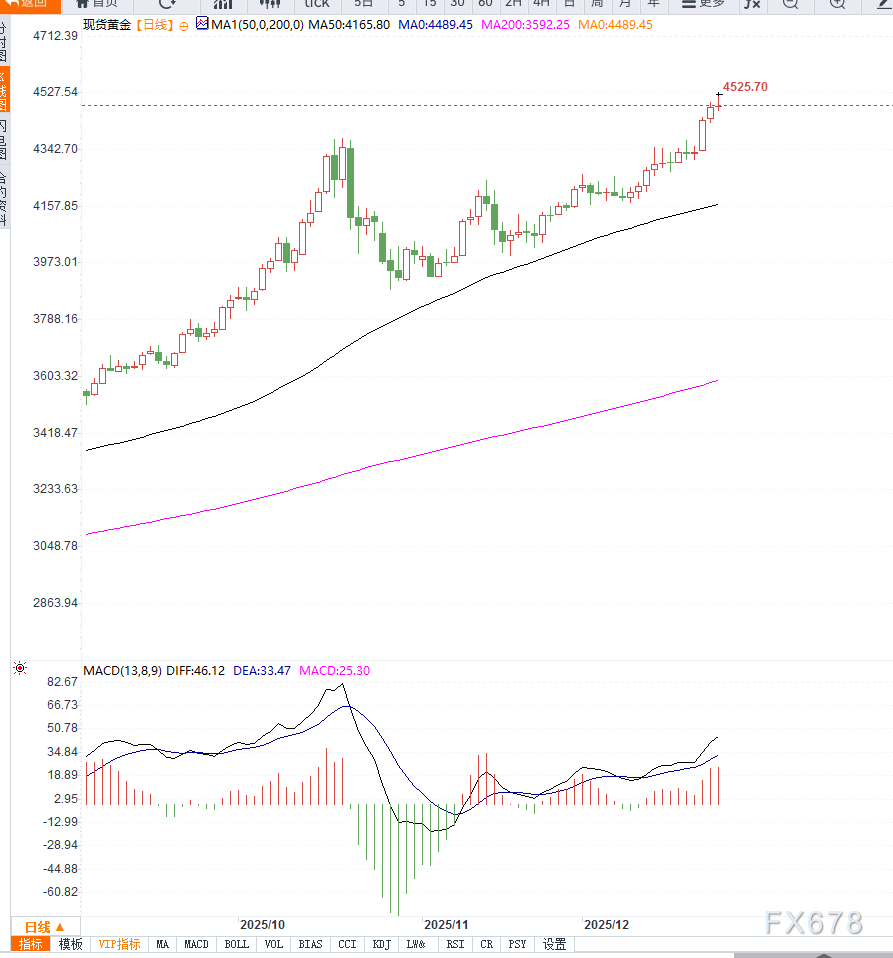 不过,14日RSI已运行至70上方,进入超买区间,提示短线存在技术性整理或高位震荡的可能。若价格能够持续站稳4500美元心理关口,上方目标有望指向4550美元,甚至测试4600美元整数位;