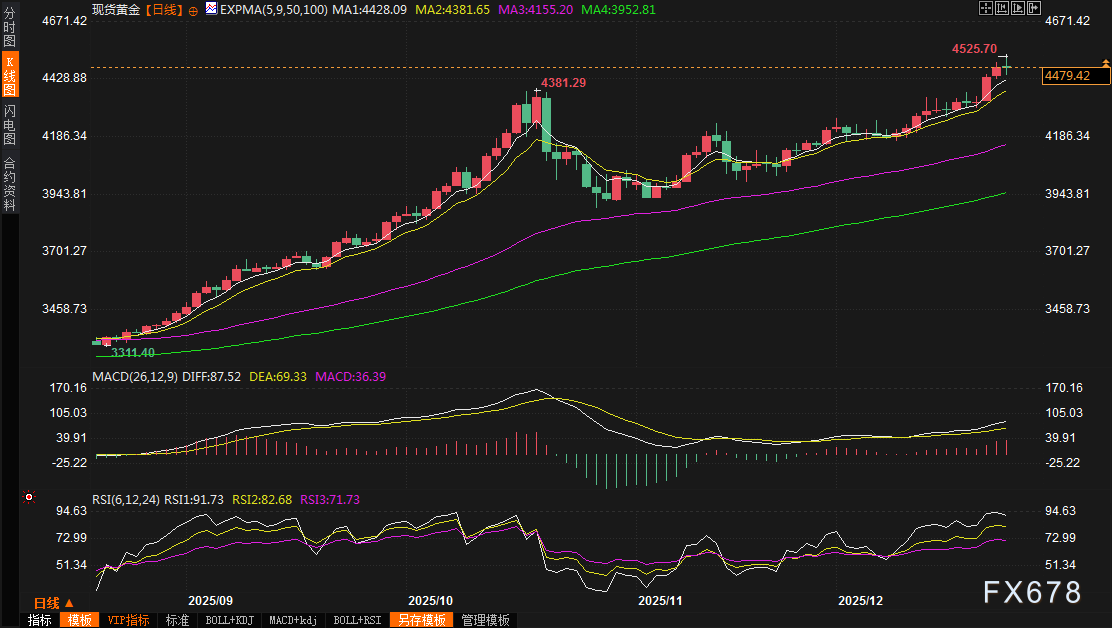 现货黄金价格在圣诞假期前夕的最后一个活跃交易日(12月24日)中收报于约4479.42美元/盎司,此前曾在日内触及4525美元的历史新高,美国黄金期货价格收报在4505美元左右。由于圣诞节期间交易流动性较为稀薄,周三(12月24日)尾盘整体呈现出平静的态势,黄金价格在4450美元至4500美元区间内徘徊。这种稳定表现被多家市场报告描述为在强劲上涨后的自然盘整阶段,许多交易者选择在年末锁定部分利润。