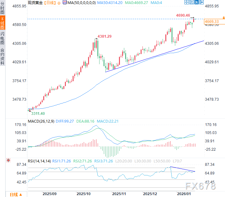 主要看涨趋势:过去数月,黄金始终维持着稳健的看涨结构,表现为高点与低点不断上移,屡次持续推动价格创下历史新高。目前尚未出现明确的技术信号预示趋势反转,但价格接近关键心理关口(4700美元)时,可能在涨势重启前进入盘整阶段或技术性回调。