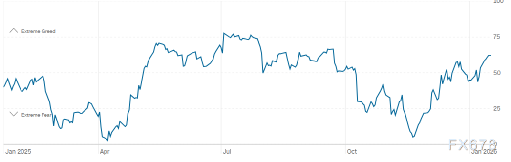 黄金通常在市场信心恶化时期受益,这一动态已在关键指标中开始显现。美国有线电视新闻网的“恐惧与贪婪指数”位于62点附近,仍处于“贪婪”区间,但该指数曲线已开始呈现明显趋平的态势,表明短期市场不确定性正在重新抬头。