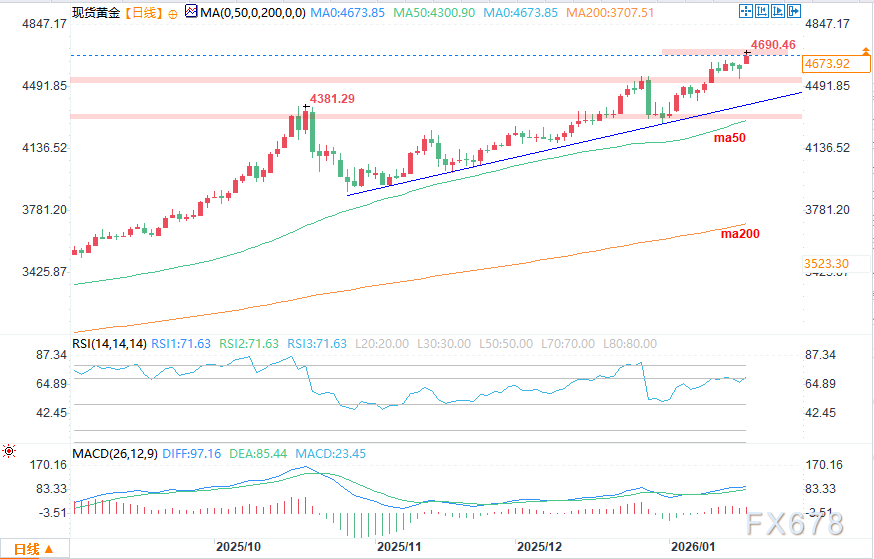 主导趋势为多头:过去数月间,黄金始终维持着稳健的看涨格局,其走势呈现出“高点不断抬高、低点持续上移”的特征,价格也因此屡创历史新高。目前来看,尚无明确的技术信号显示趋势即将反转,不过需要注意的是,在价格逼近关键心理关口后,黄金可能会进入盘整阶段或出现技术性回调,随后再延续上行趋势。