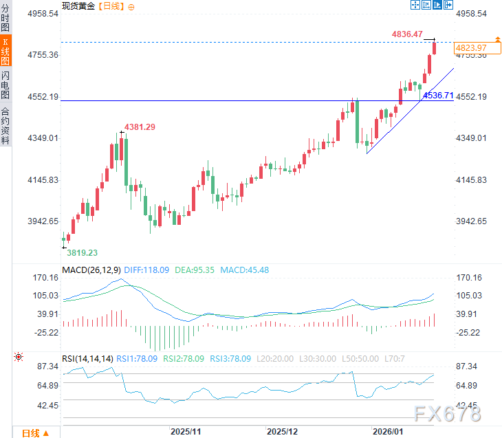 周三(1月21日)亚市时段,现货黄金行情强势震荡上行,延续前两个交易日涨势,日内涨幅约1.35%,不断挑战高点,截至9:40,一度触及每盎司4836.47美元的历史新高,进一步逼近5000.00美元的关键目标。避险买盘持续支撑金价多头动能,黄金现交投于4825美元/盎司附近。