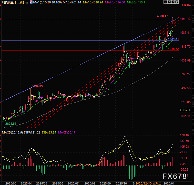 现货黄金自日内高点大幅回落后又站回4850之上,目前交投于4866美元/盎司一线,欧洲交易时段早盘曾触及4888美元/盎司附近的历史极值,牛市行情未显丝毫疲态,本周累计涨幅已超6%。