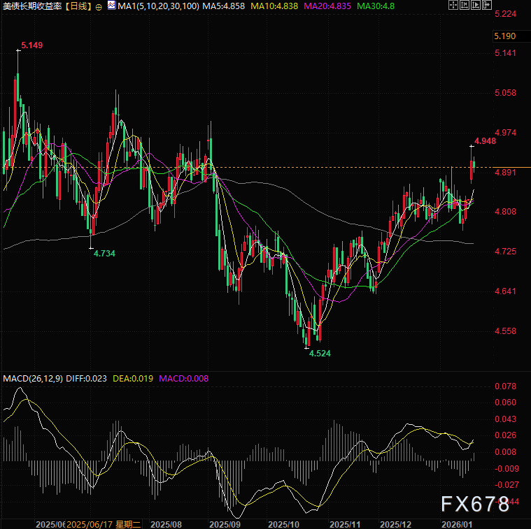 债市与汇市同样呈现显著异动:美国长期国债价格逆势走低,10年期美国国债收益率从周五的4.24%上行至4.3%,有分析认为美债的抛售并非全是地缘政治因素,因为日本30年期国债收益率已经超过4%,美国为4.89%,于是外溢效应影响了美债,但也暗示市场着实对日本和美国近期的举动大为不满,目前美国国债收益率开始整体回落,暗示气氛有所缓和。