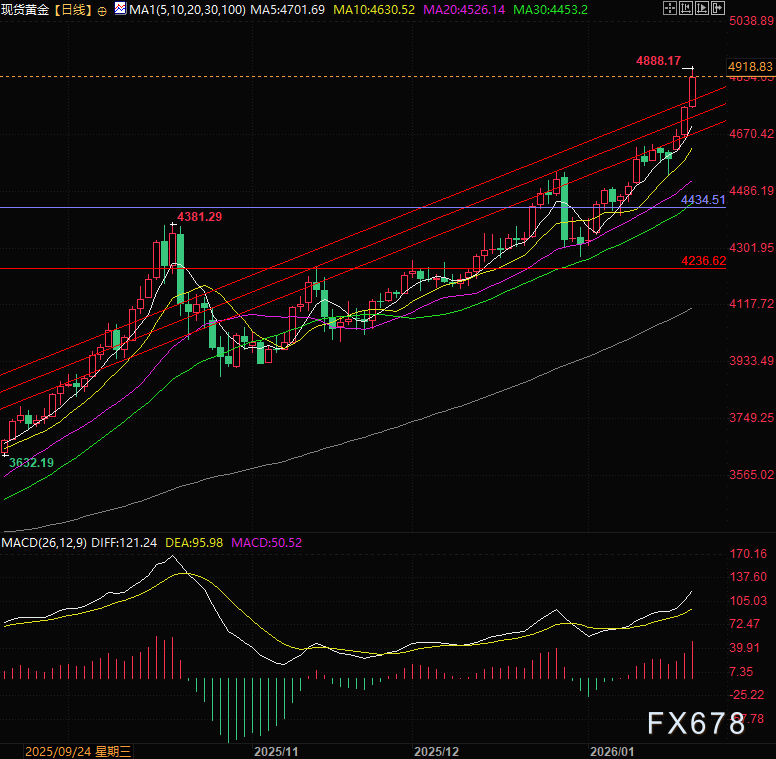 与美元、美债、美股走势相反的是贵金属市场,美欧贸易战潜在风险升温推动避险需求激增,黄金、白银价格周二刷新历史新高,其中黄金周三继续快速上涨,盘中不断刷新新高至最高4888成为投资者追捧的核心避险标的,现货黄金目前回调后回升至4866附近,仍然显示比较好的承接。
