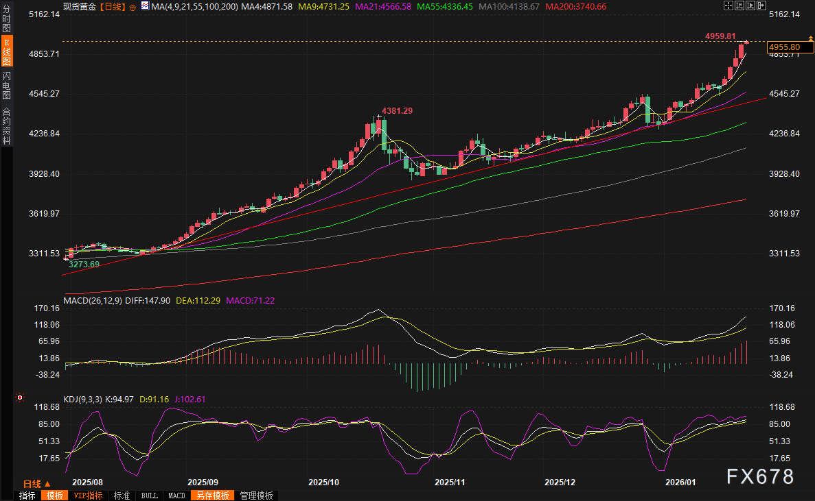 在2026年的开年之际,全球黄金市场迎来了一场史无前例的狂飙盛宴。现货黄金价格周四(1月22日)首次突破每盎司4900美元大关,并持续刷新历史新高,直至周五(1月23日)亚市早盘,截止07:57,触及4960.43美元/盎司的高点。这一波涨势不仅带动了白银和铂金等贵金属创下纪录新高,还反映出市场对地缘政治不确定性、美元疲软以及美联储宽松政策的强烈反应。作为一种传统的避险资产,黄金在当前复杂的国际环境中脱颖而出,成为投资者追捧的焦点。